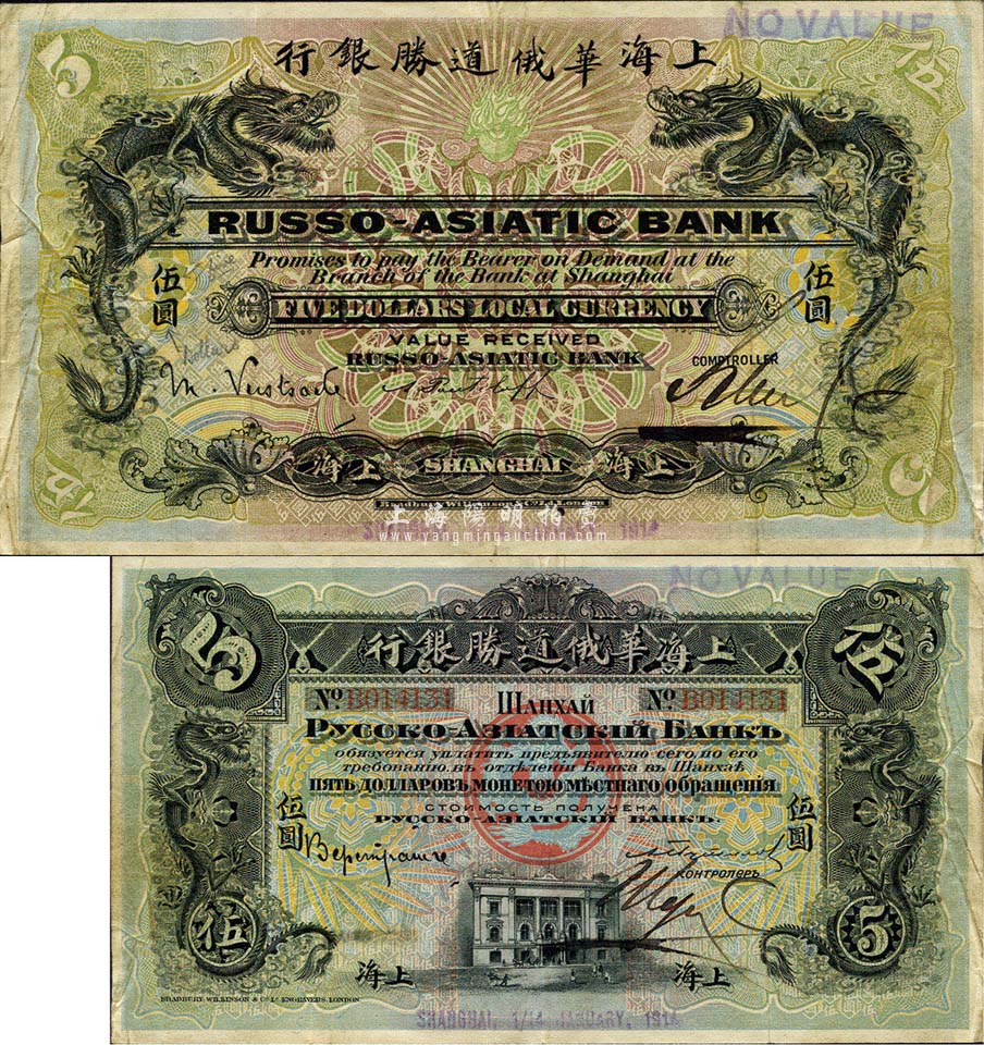 1914年上海华俄道胜银行伍圆,上海地名,双龙图印刷极为精致;森本勇先生藏品,罕见,八成新