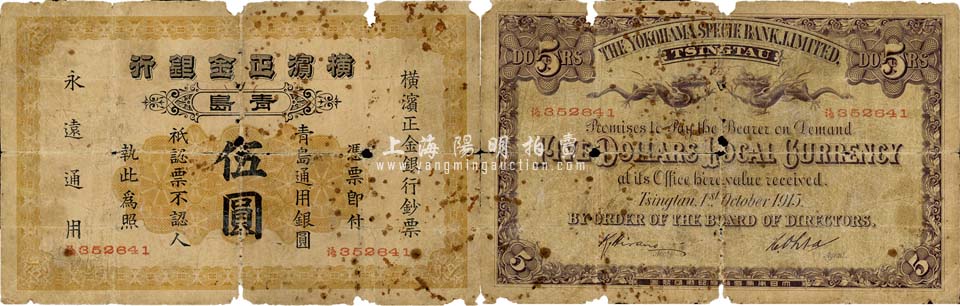 1915年横滨正金银行·青岛通用银圆伍圆,青岛地名;森本勇先生藏品,少见,有破损,近六成新
