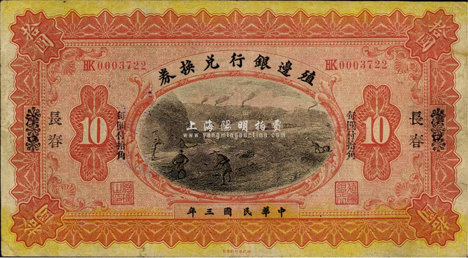 民国三年(1914年)殖边银行兑换券小洋拾圆,汉口改长春地名,“每圆付拾角”为宋体黑字,森本勇先生藏品,源于著名集钞家吴筹中先生之旧藏,七五成新