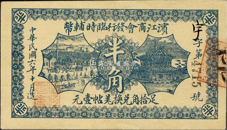 民国六年(1917年)滨江商会发行临时辅币半角,黑色号码券,以沙俄羌帖为货币单位;森本勇先生藏品,九五成新