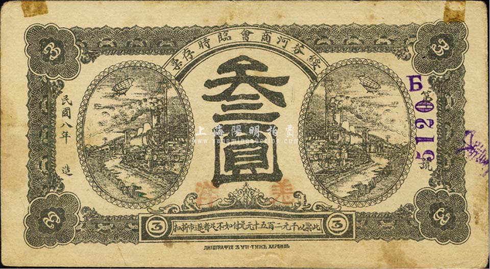 民国八年(1919年)绥芬河商会临时存票羌洋叁圆,此地原属吉林省东宁县,今归黑龙江省管辖;森本勇先生藏品,少见,上端有小贴痕,八成新