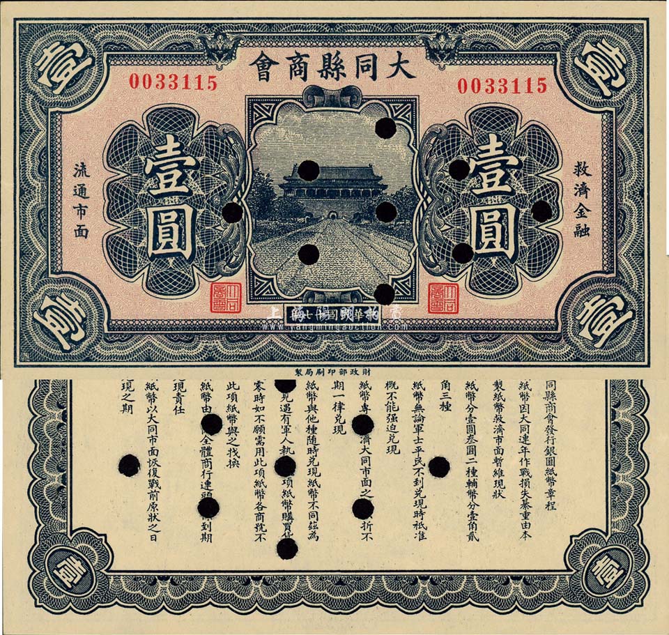民国十七年(1928年)大同县商会壹圆,财政部印刷局制,背面章程中有“大同连年作战损失”等内容;森本勇先生藏品,已打孔注销,九成新