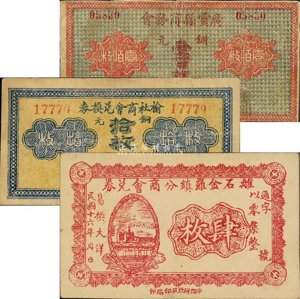 山西商会纸币3种,详分:榆社商会兑换券铜元拾枚;广灵县商务会铜元壹百枚;离石金罗镇分商会兑券1927年肆枚;森本勇先生藏品,七至九成新