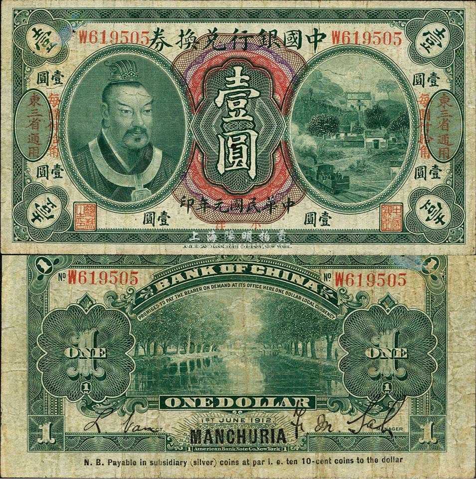 民国元年(1912年)中国银行兑换券黄帝像小洋壹圆,左右均印“东三省通用·每圆付拾角”字样,萨福懋·范磊签名;森本勇先生藏品,源于香港前辈名家卢志用先生之旧藏,七五成新