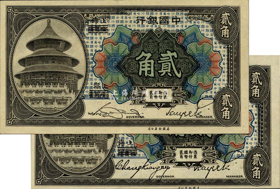 1918年中国银行贰角共2枚不同,哈尔滨改上海地名,详分:张嘉璈·贝祖诒签名、宋汉章·贝祖诒签名;森本勇先生藏品,九至九八成新