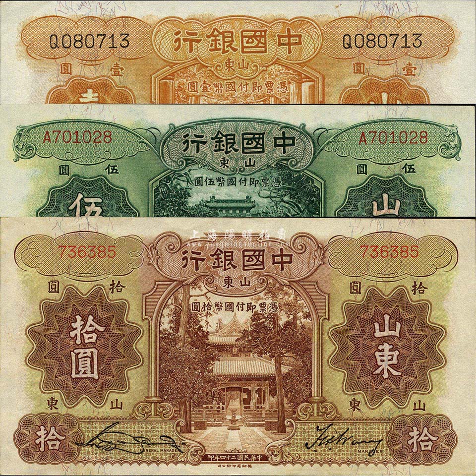 中国银行山东地名券共3枚全套,详分:1934年桔色壹圆、绿色伍圆、1935年棕色拾圆,其中拾圆为无字轨,余2枚为单字轨,宋汉章·王祖训签名;森本勇先生藏品,上佳品相,九五至全新