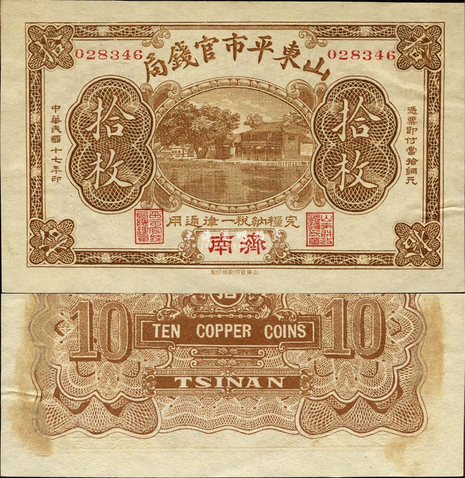 民国十七年(1928年)山东平市官钱局铜元拾枚,济南地名,此乃该局第一版纸币,未见图谱记载,目前亦属首见;森本勇先生藏品,源于日本前辈名家末次节雄之旧藏,珍罕,背有档案贴痕(可去除无碍),未折九五成新