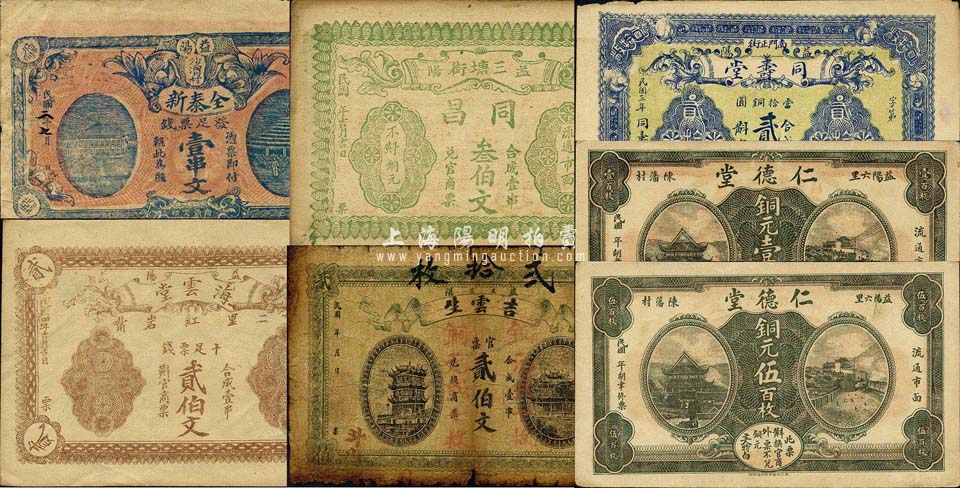 益阳县钱票7种,详分:全泰新1913年壹串文;同寿堂1914年贰拾枚;海云堂1915年贰伯文;吉云生官票贰伯文;同昌叁伯文;仁德堂铜元壹百枚、伍百枚;森本勇先生藏品,六至九五成新