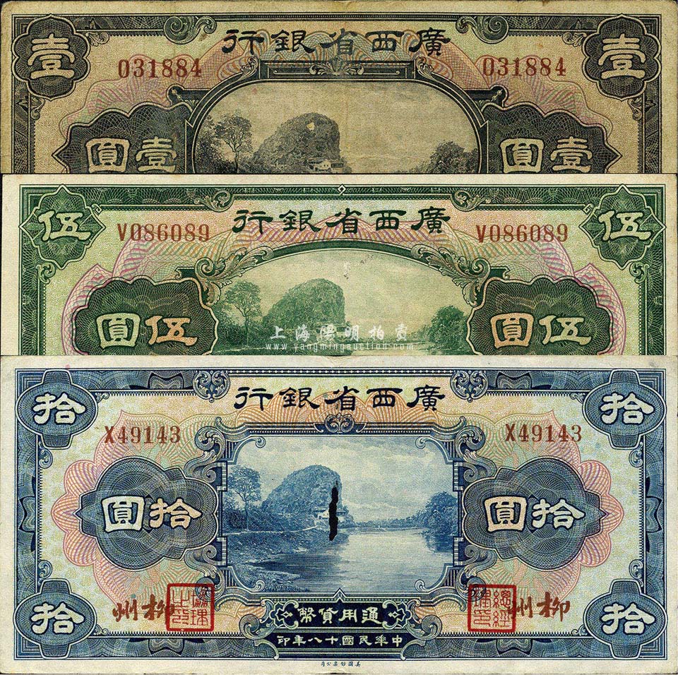 民国十八年(1929年)广西省银行美钞版壹圆、伍圆、拾圆共3枚全套,柳州地名;森本勇先生藏品,其中1枚有破损,六至八成新