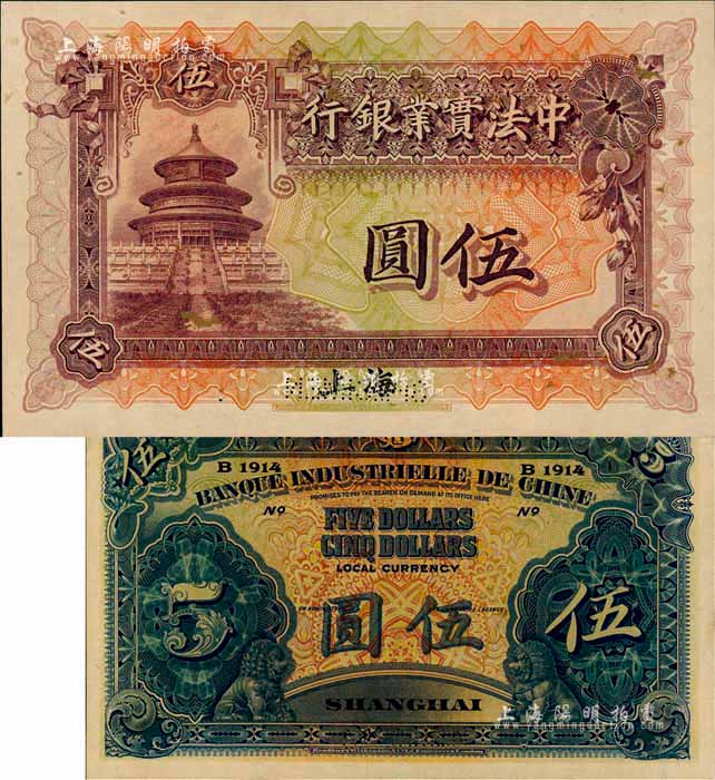 1914年中法实业银行伍圆样本券,上海地名;森本勇先生藏品,源于日本前辈名家末次节雄之旧藏,少见,九八成新