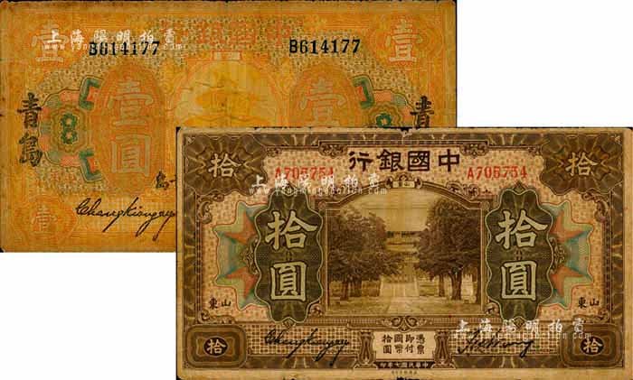 民国七年(1918年)中国银行桔色山东·青岛壹圆、棕色山东拾圆共2枚不同,张嘉璈·王祖训签名;森本勇先生藏品,七成新