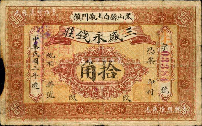 民国三年(1914年)三盛永钱庄拾角,奉天黑山县钱庄钞票,背印商务分会告示;森本勇先生藏品,源于日本前辈名家片冈裕(汤岛)之旧藏,少见,边有小损,七成新