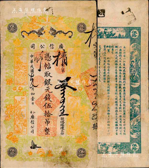 民国七年(1918年)江省·广信公司银元钱伍拾吊,此为清代延用版,与光绪或宣统版图文完全相同;森本勇先生藏品,罕见,边有修补,七五成新