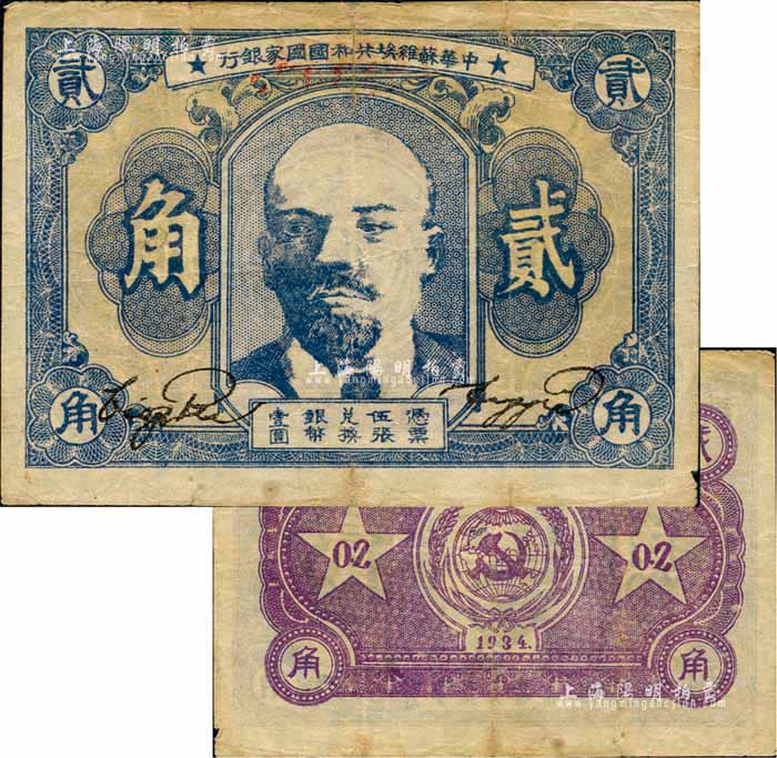 1934年中华苏维埃共和国国家银行列宁像贰角,森本勇先生藏品,有小贴痕,七五成新