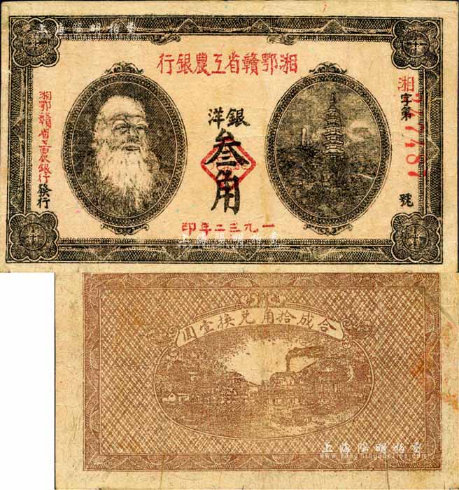 1932年湘鄂赣省工农银行银洋叁角,上印马克思头像,森本勇先生藏品,八五成新