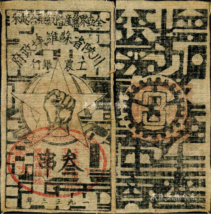 1933年川陕省苏维埃政府工农银行叁串布币,白粗布,森本勇先生藏品,八成新