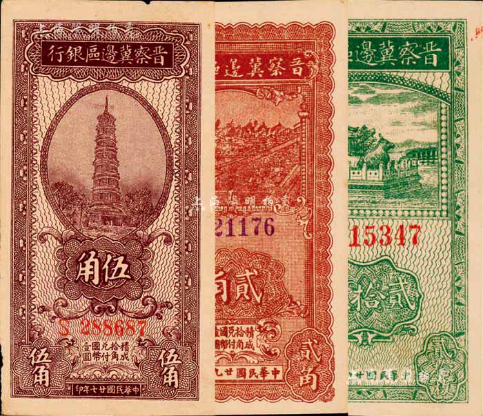 晋察冀边区银行辅币券3种,详分:1938年伍角、1939年贰拾枚、1940年贰角,森本勇先生藏品,八五至全新