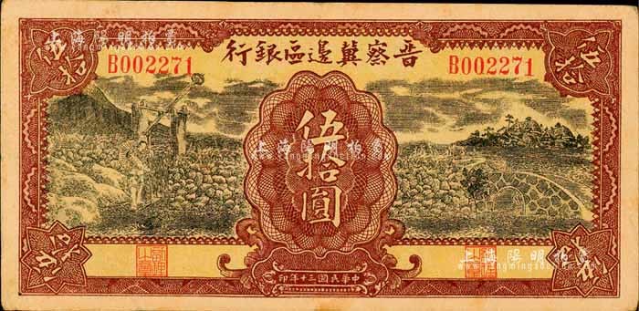 民国三十年(1941年)晋察冀边区银行打水石桥图伍拾圆,森本勇先生藏品,八成新