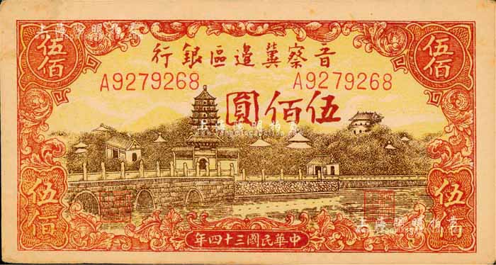 民国三十四年(1945年)晋察冀边区银行塔桥风景图伍佰圆,森本勇先生藏品,未折九五成新