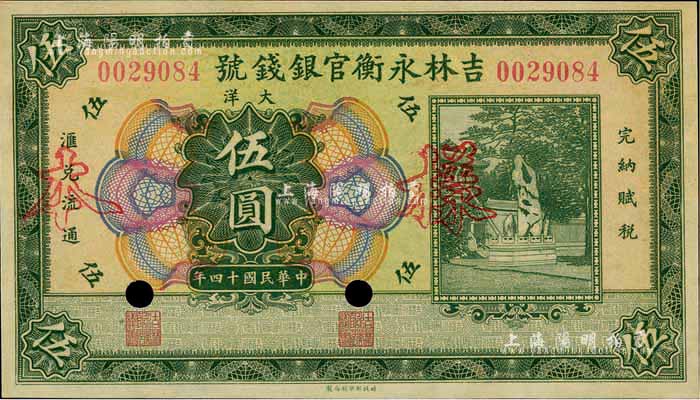 民国十四年(1925年)吉林永衡官银钱号大洋伍圆,正票改作样本,未正式发行品,微有黄斑,未折九五成新