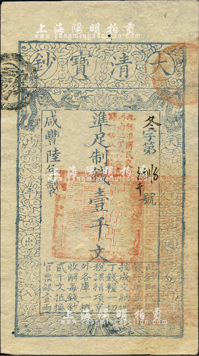 咸丰陆年(1856年)大清宝钞壹千文,冬字号,加盖“此钞准商民交纳河南地丁关税盐课一切正杂钱粮”;柏文先生藏品,九五成新