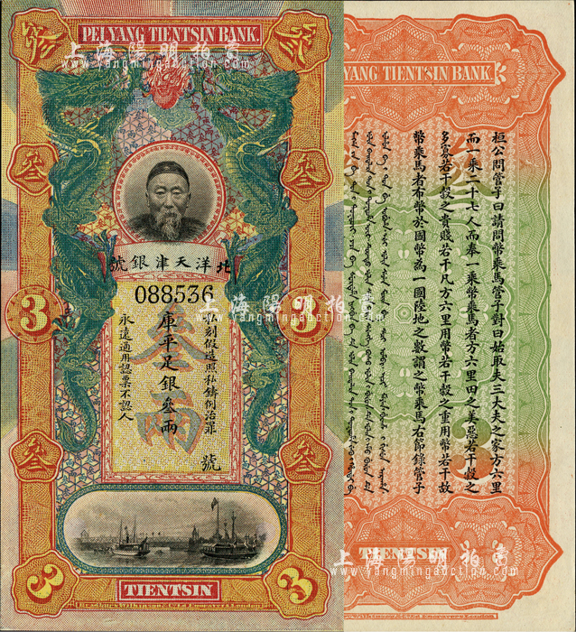 北洋天津银号库平足银叁两,上印李鸿章头像;柏文先生藏品,九八成新