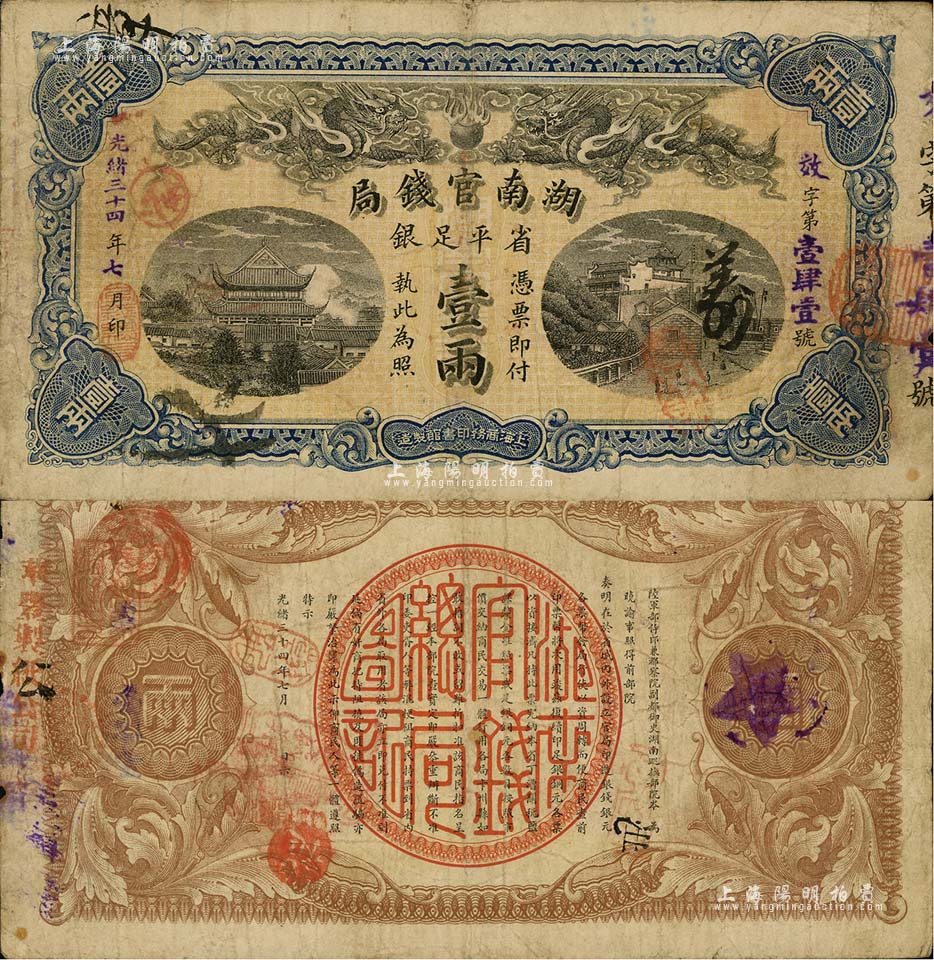 光绪三十四年(1908年)湖南官钱局省平足银壹两,其正面年份为蓝字加盖,背面年份下所盖似为“洪江”地名戳;南宁刘绍峰先生藏品,近八成新