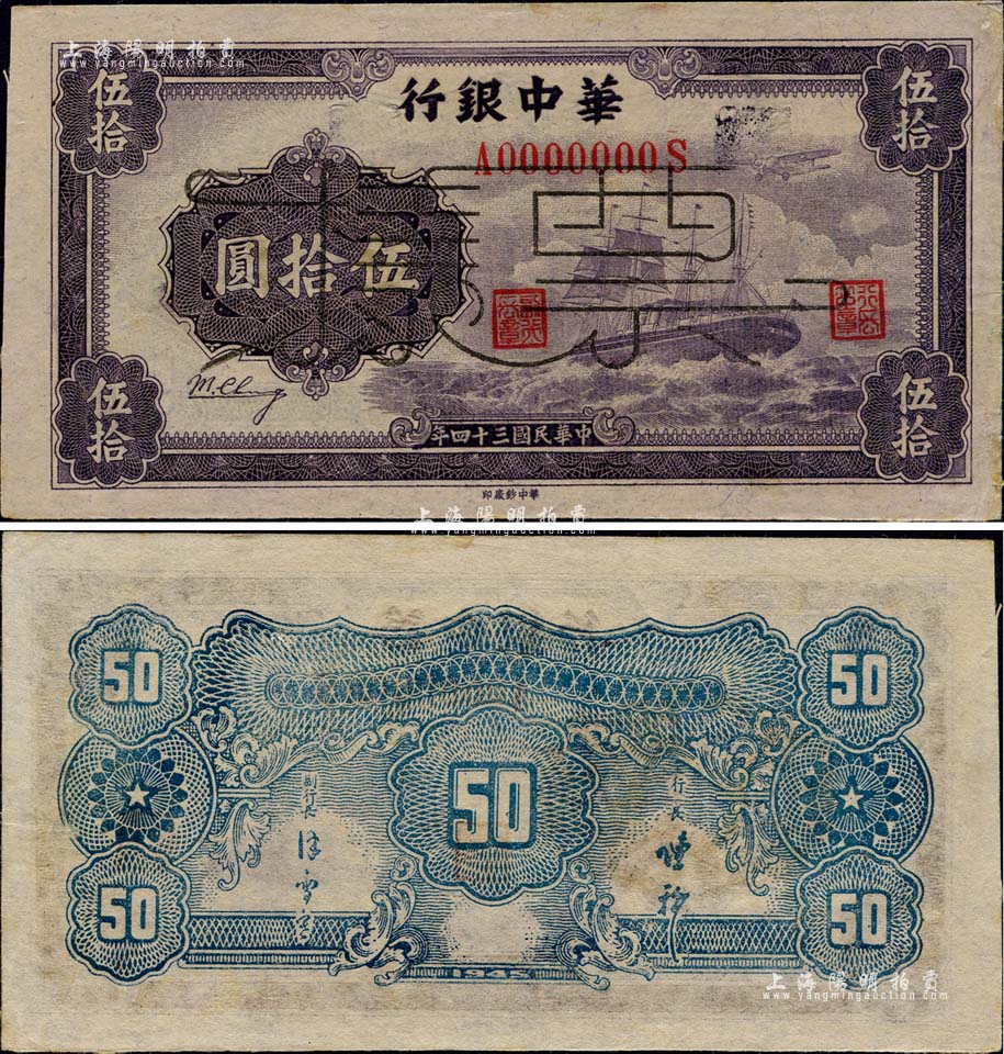 民国三十四年(1945年)华中银行军舰图伍拾圆票样,薄纸版,背面印有中文签名;台湾藏家出品,九至九五成新