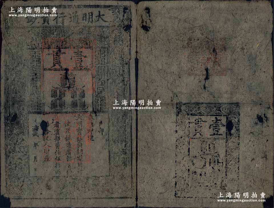 洪武年大明通行宝钞壹贯,中期版,票上字体笔画有力,尤其正背红色章印甚为明晰;海外回流品,票面整体完整,中有小缺损,近七成新