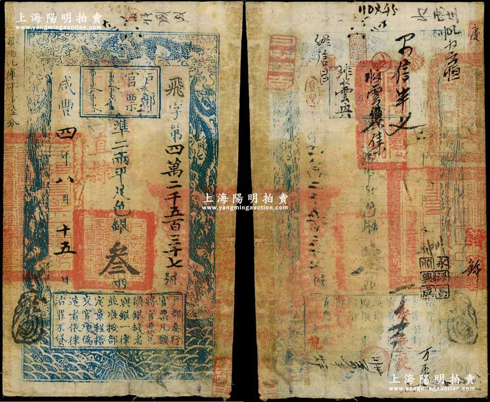 咸丰四年八月十五日(1854年)户部官票叁两,飞字号,直隶地名,背有官印三处及背书十余处,近八成新