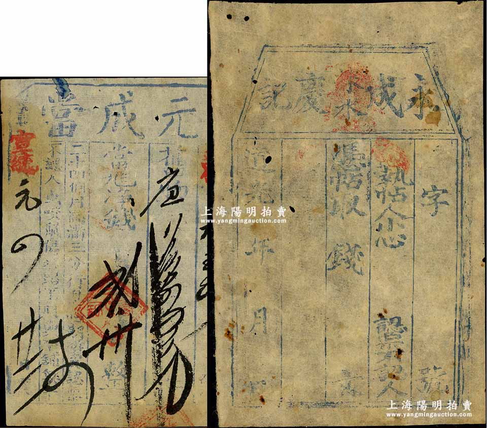 道光年(涞水县)永成庆记钱帖未填用,乃属迄今所见最早之河北省钞票;台湾藏家出品,七成新(另附:宣统元年元成当发行之当票1枚)