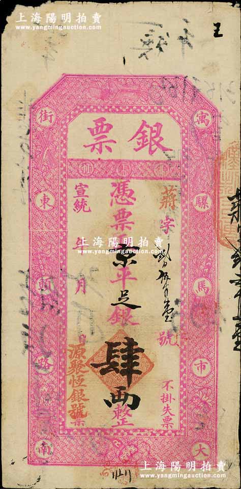宣统年(北京·寓骡马市大街东头路南)源聚恒银号“银票”京平足银肆两,有背书十余处,可证其辗转流通于京师;江南藏家出品,原票七五成新