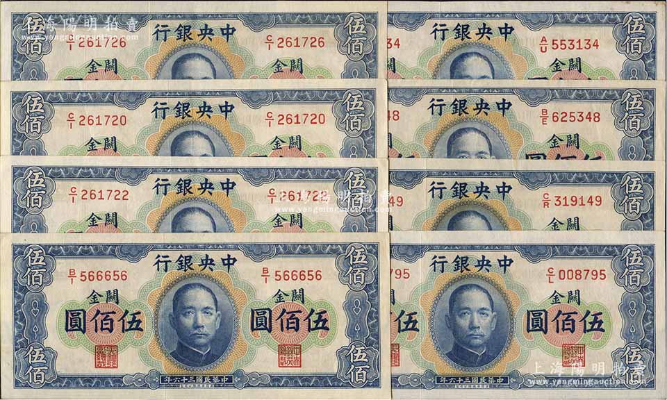 民国三十六年(1947年)中央银行关金华德路版横式伍佰圆共8枚,前辈藏家出品,九至九五成新
