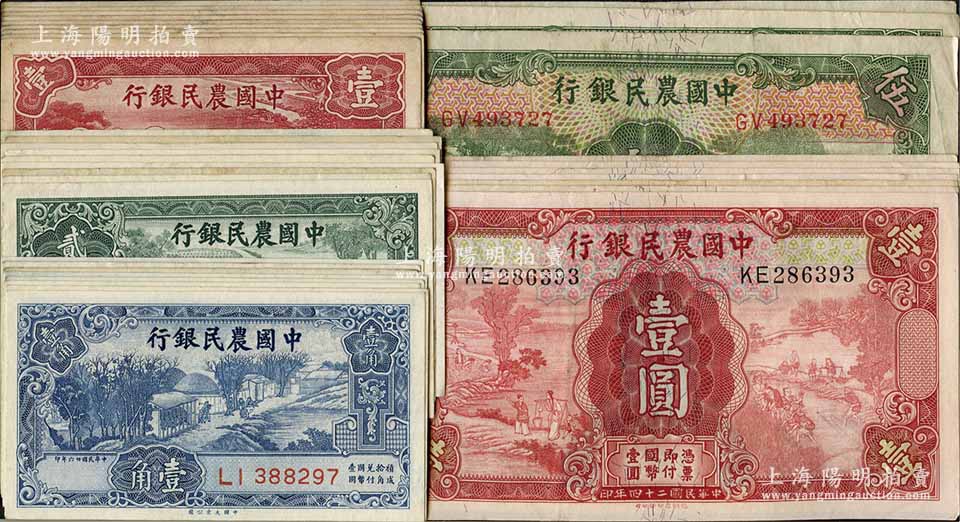 中国农民银行纸币共36枚,详分:1935年德纳罗版壹圆7枚、伍圆3枚,1937年大业版壹角8枚、贰角9枚,1940年大业版壹圆9枚;前辈藏家出品,八至九八成新