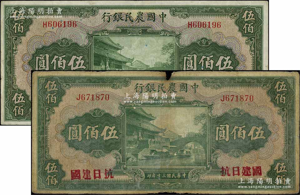 民国三十年(1941年)中国农民银行伍佰圆共2枚,单字轨,其中1枚加盖“抗日建国”字样,六五至八成新