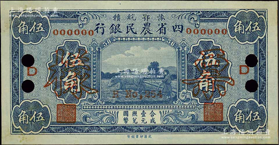 豫鄂皖赣四省农民银行(1933年)蓝色伍角样本券,正背共2枚,郭外峰签名,加印“D”字;前辈藏家出品,罕见,九五成新