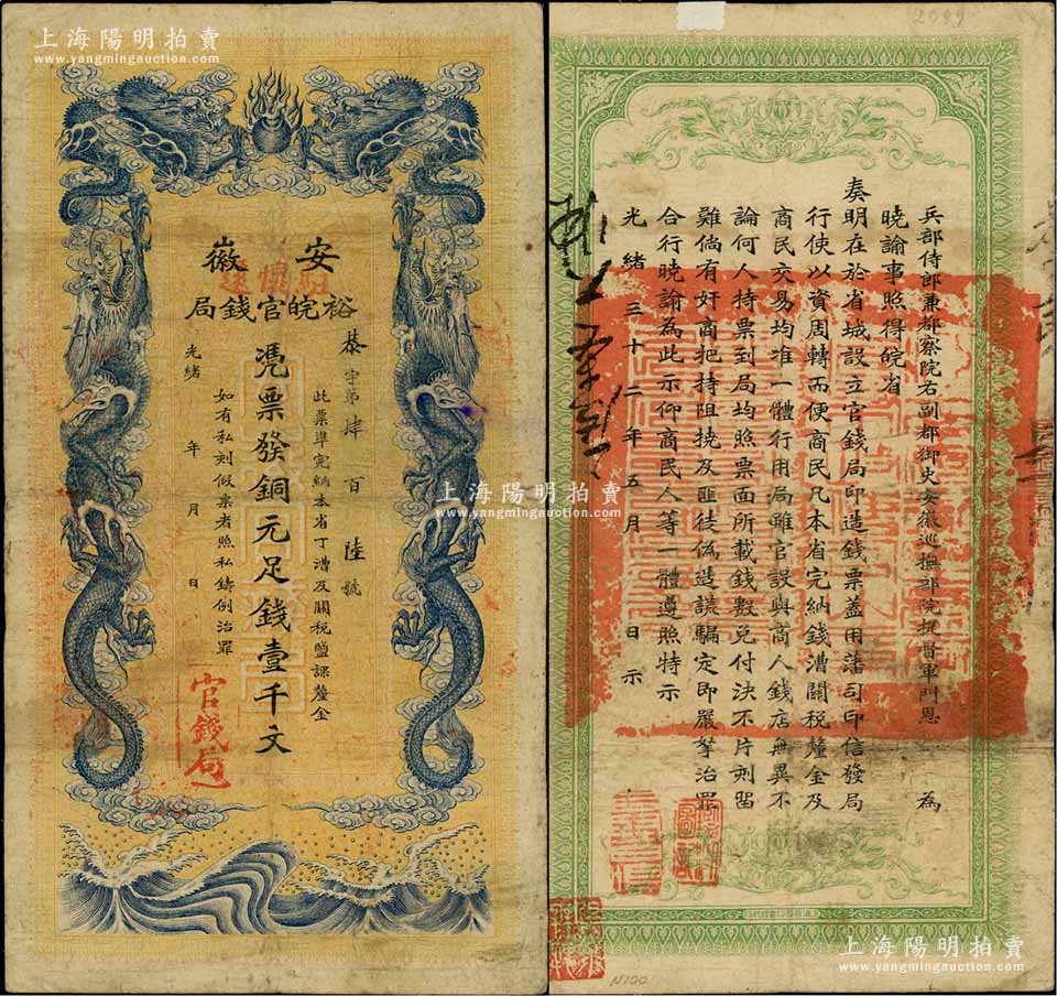 光绪三十二年(1906年)安徽裕皖官钱局铜元足钱壹千文,加盖“驻怀远”地名;白尔文先生藏品,七五成新