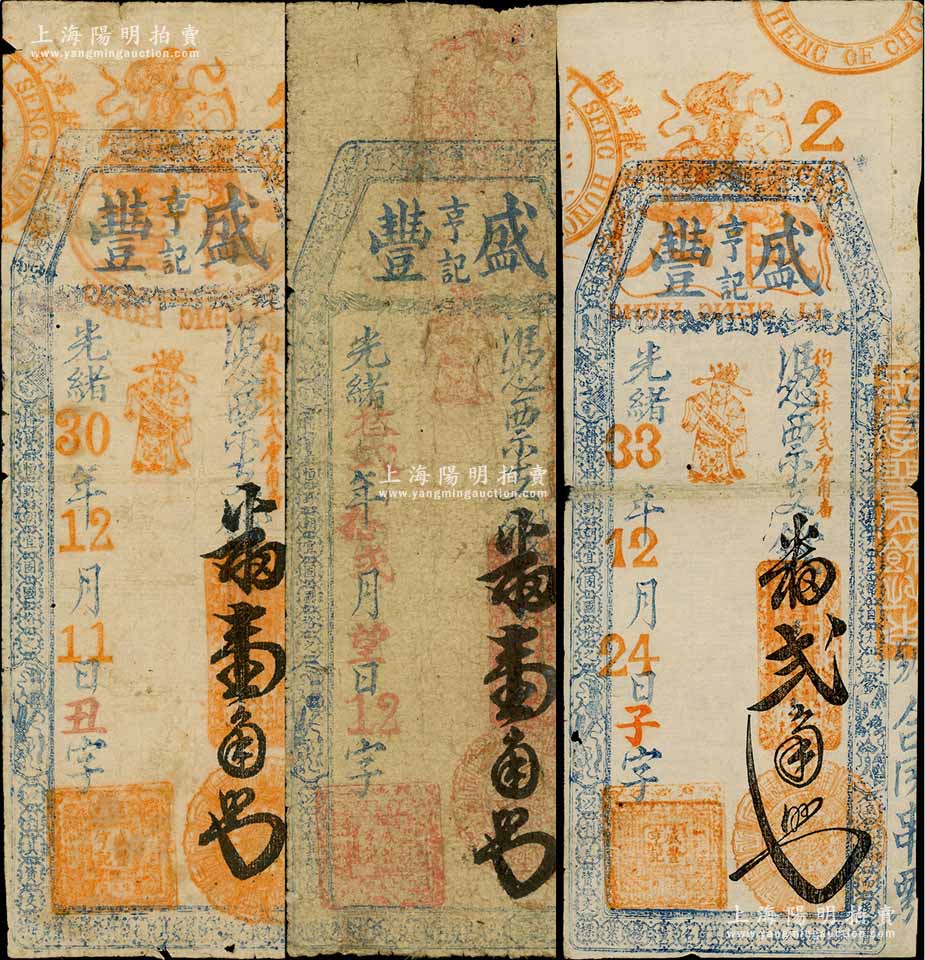 盛丰亨记台伏钞票3种,详分:光绪30年(1904年)番壹角、光绪叁贰年(1906年)番壹角、光绪33年(1907年)番贰角;白尔文先生藏品,六至七五成新