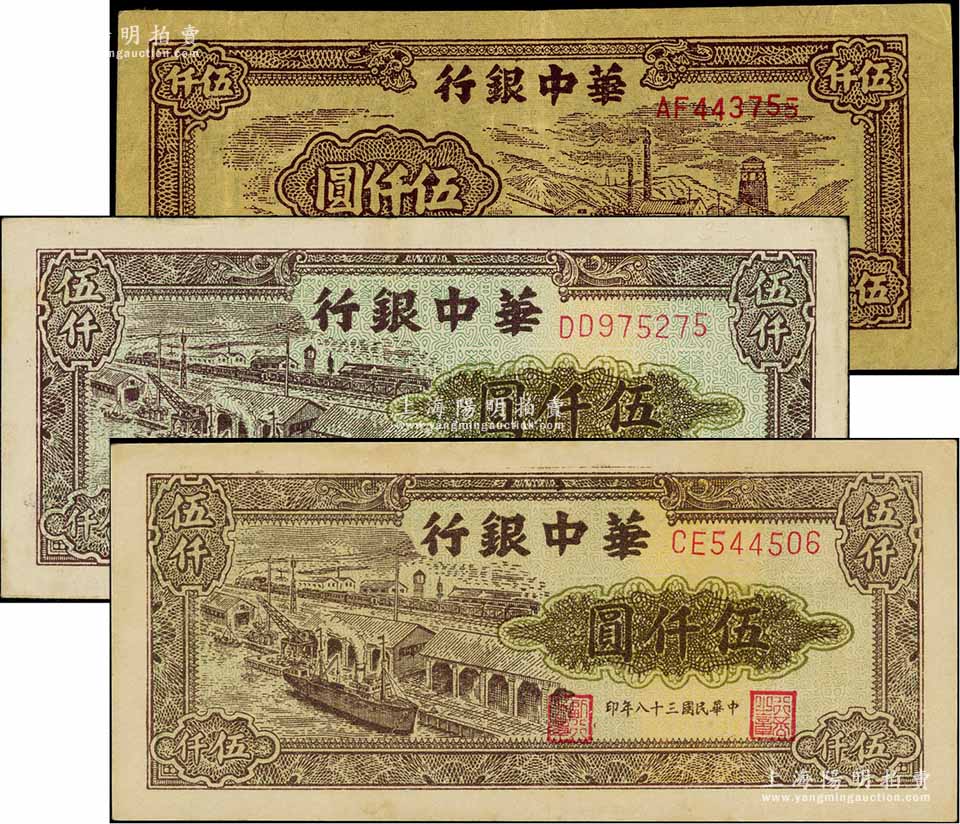 民国三十八年(1949年)华中银行矿山图伍仟圆1枚、码头图伍仟圆2枚(正面颜色略有不同),合计共有3枚;白尔文先生藏品,八至八五成新