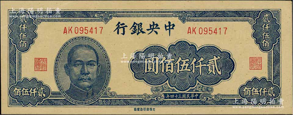 民国三十四年(1945年)中央银行大东重庆厂贰仟伍佰圆,海外藏家出品,九五成新
