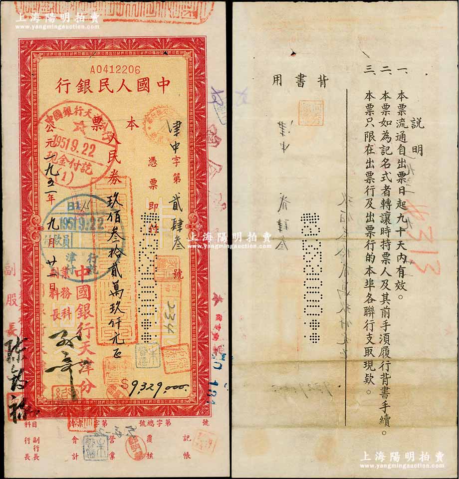 1951年中国人民银行本票人民币玖佰叁拾贰万玖仟元,由天津中国银行业务科签发;此种第一版人民币本票以前多见未填用之空白票,而此流通票存世罕见,值得珍视,八成新
