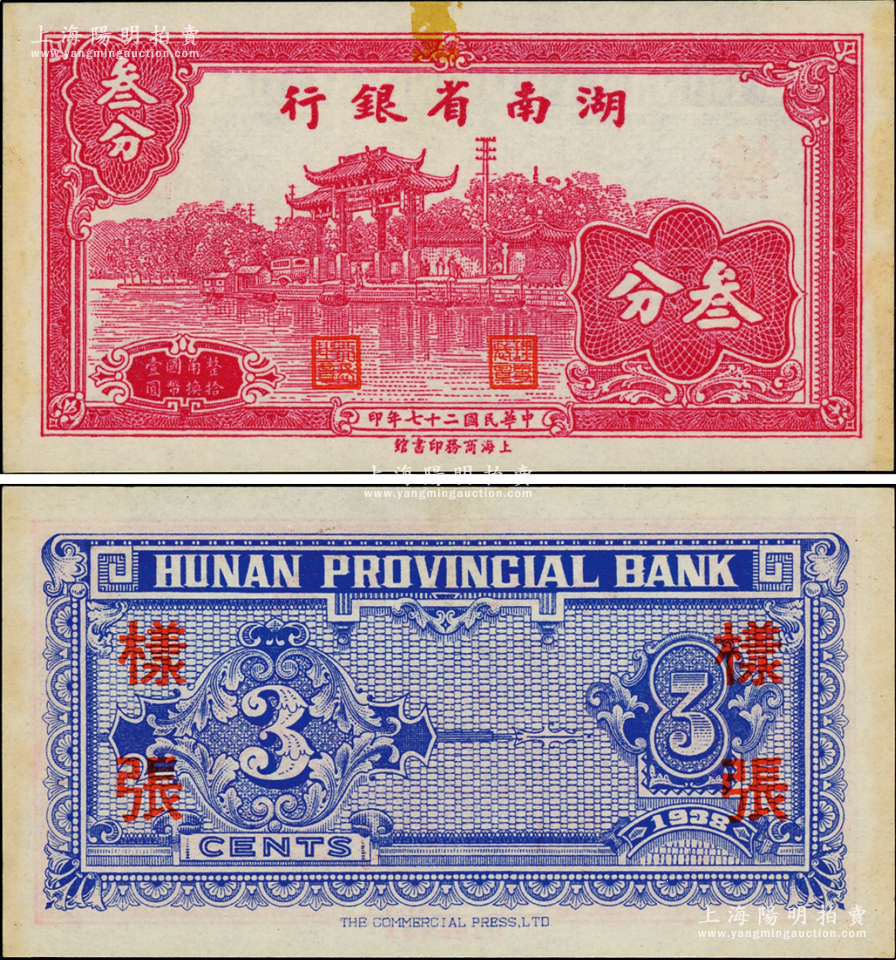 民国二十七年(1938年)湖南省银行商务版叁分样张,正背面合印,上印杭州西湖“光华复旦”牌坊图;柏文先生藏品,未折九成新