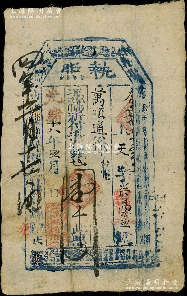 光绪十八年(1892年)万顺通记·执照壹千文,究其风格或属陕西长安县钱票,昔年曾在李安深前辈专场中见有实物;柏文先生藏品,少见,近八成新