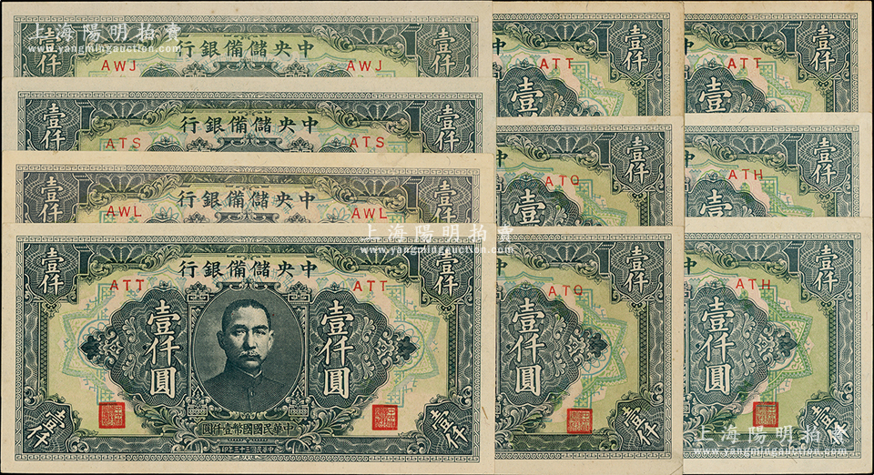 民国三十三年(1944年)中央储备银行长框短号券壹仟圆共10枚,资深藏家出品,品相甚佳,九至九八成新,敬请预览