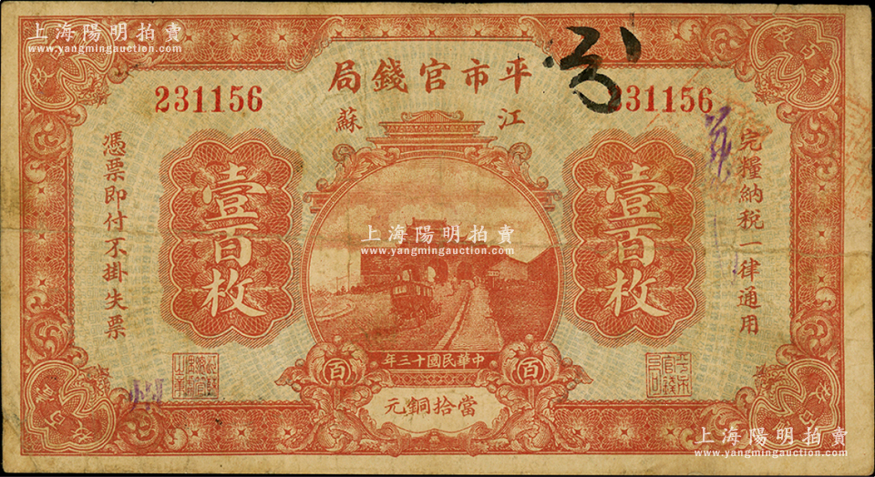 民国十三年(1924年)江苏平市官钱局壹百枚,加盖“徐州”地名,诚属江苏纸币之珍罕品;资深藏家出品,原票七五成新