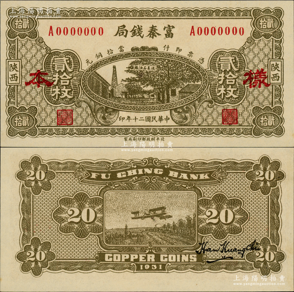 民国二十年(1931年)陕西富秦钱局当拾铜元贰拾枚样本,正背面合印,上印延长石油厂,背印飞机图,属未正式发行券(注:此券正面花纹与流通票不同,且无底纹);资深藏家出品,珍罕,九八成新
