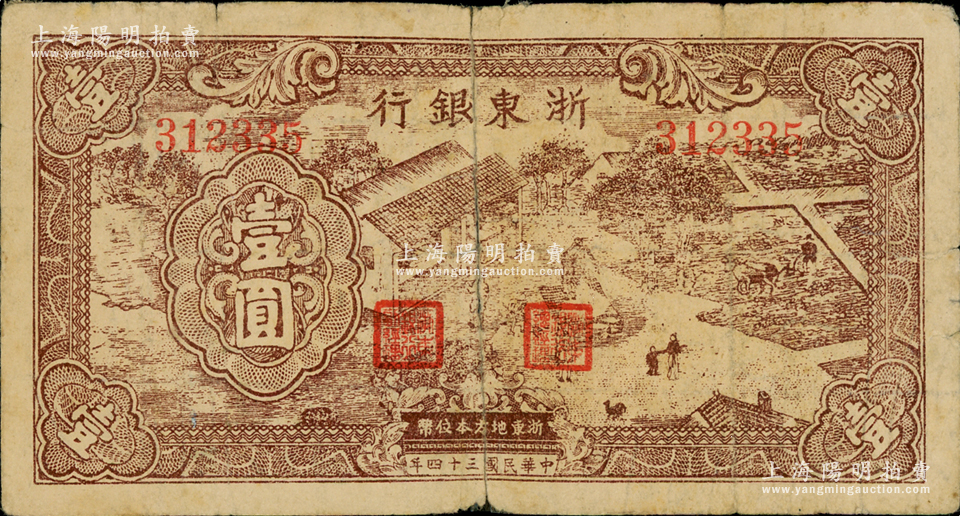 民国三十四年(1945年)浙东银行棕色农作图壹圆,浙东新四军抗币;资深藏家出品,背有贴补,七成新