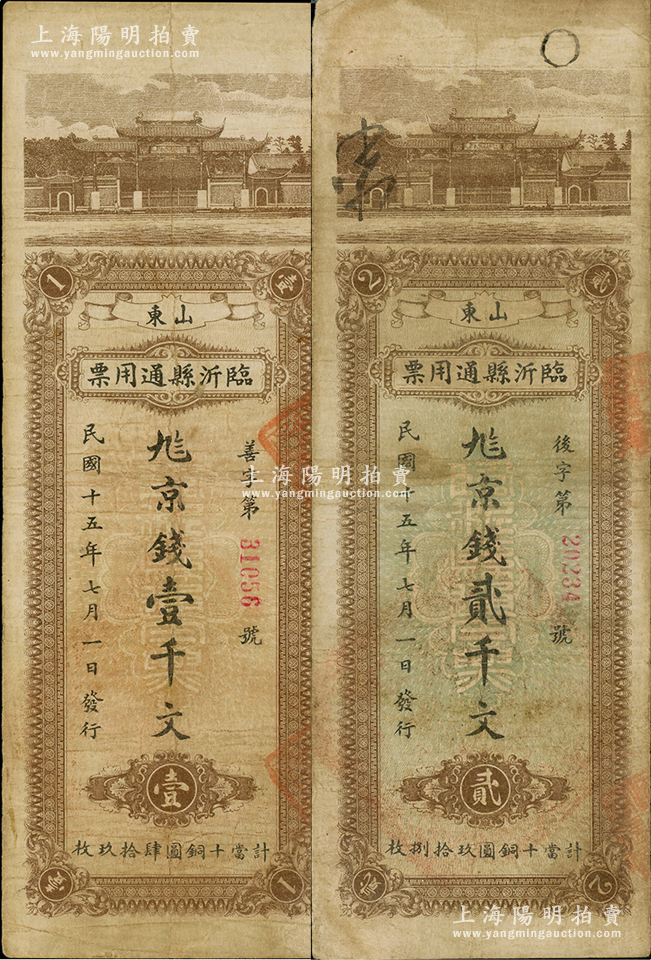 民国十五年七月一日(1926年)山东临沂县通用票壹千文、贰千文共2枚不同,均上印杭州西湖“日月光华”牌坊,背印湖心亭;此钞发行共分1月、6月和7月三种月份,是项“七月”版壹千文存世颇为稀见;日本回流品,七至八成新