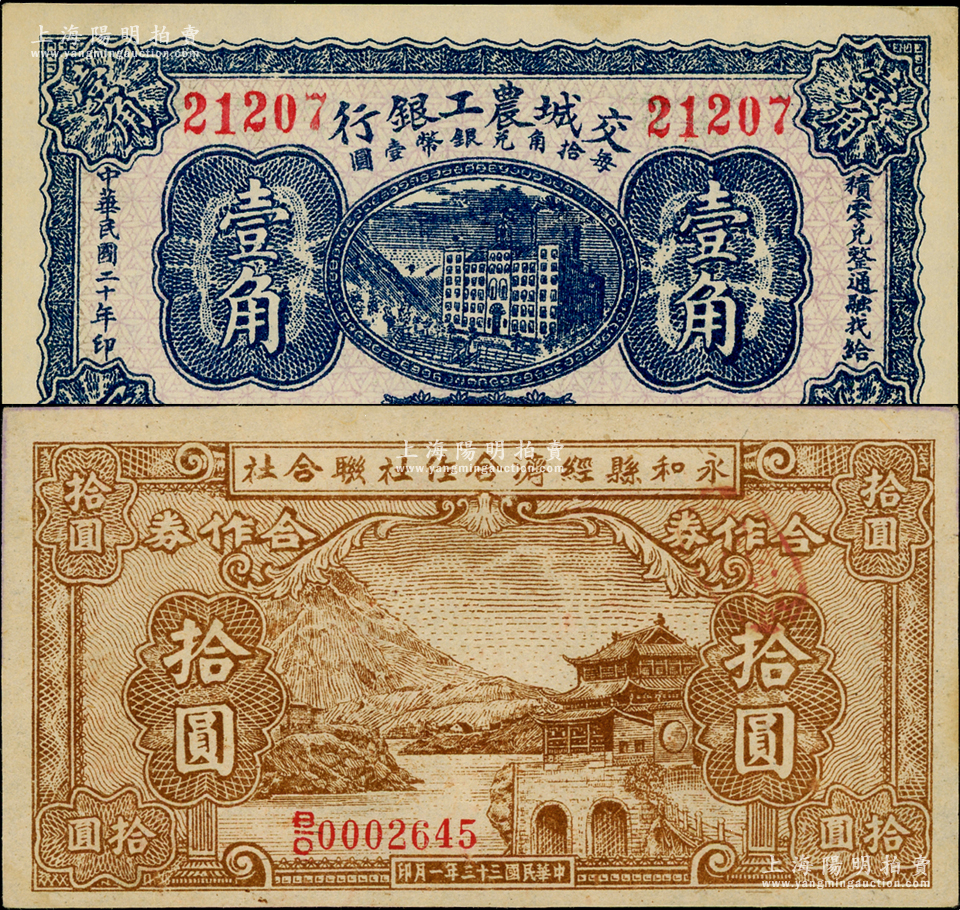 山西纸币2种,详分:交城农工银行1931年壹角;永和县经济合作社联合社1944年合作券拾圆,属抗战时代阎锡山政权所发行;原票九五至九八成新,敬请预览