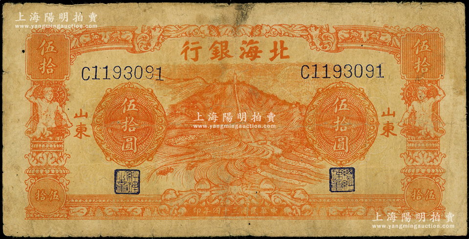 民国三十四年(1945年)北海银行桔色山景梯田图伍拾圆,山东地名;日本回流品,原票七至七五成新